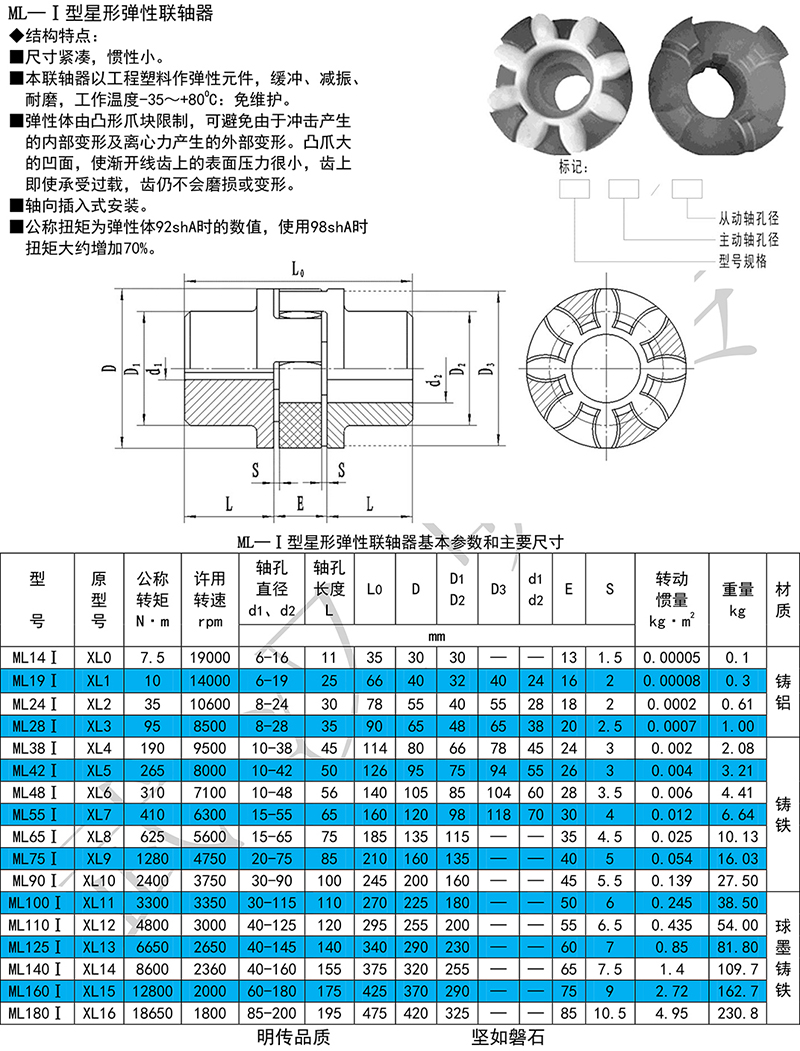 星形彈性聯(lián)軸器是由兩個(gè)帶凸爪形狀相同的半聯(lián)軸器和彈性元件組成,利用星形彈性元件置于兩半聯(lián)軸器凸爪之間,以實(shí)現(xiàn)兩半聯(lián)軸器的聯(lián)接。該聯(lián)軸器的結(jié)構(gòu)與梅花形彈性聯(lián)軸器基本相同,區(qū)別在于彈性元件的形狀分別是星形和梅花形,性能和梅花形彈性聯(lián)軸器相同,具有一定補(bǔ)償兩周相對(duì)偏移、減振、緩沖性能,徑向尺寸小、結(jié)構(gòu)簡單、不用潤滑承、載能力高,維護(hù)方便等特點(diǎn)。適于聯(lián)接兩同軸線,起動(dòng)頻繁,正反轉(zhuǎn)多變的傳動(dòng)軸系,傳遞轉(zhuǎn)矩20~25000N·m,工作環(huán)境溫度-35~80℃。