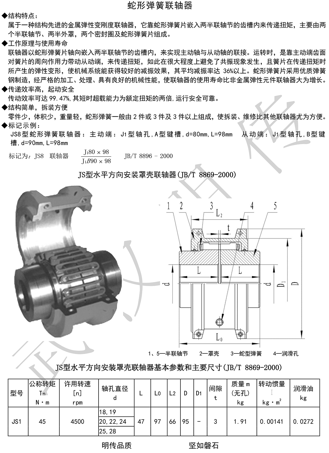 聯(lián)軸器以蛇形彈簧片軸向嵌入兩半聯(lián)軸節(jié)的齒槽內(nèi),來實現(xiàn)主動軸與從動軸的聯(lián)接。運轉(zhuǎn)時,是靠主動端齒面對簧片的周向作用力帶動從動端,來傳遞扭矩,如此在很大程度上避免了共振現(xiàn)象發(fā)生,且簧片在傳遞扭矩時所產(chǎn)生的彈性變形,使機械系統(tǒng)能獲得較好的減振效果,其平均減振率達36%以上。蛇形彈簧片采用優(yōu)質(zhì)彈簧鋼制造,經(jīng)嚴格的加工、處理、具有良好的機械性能,使聯(lián)軸器的使用壽命比非金屬彈性元件聯(lián)軸器大為增長。